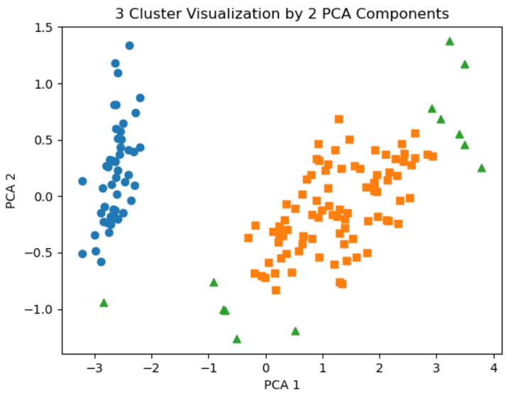PCA를 이용하여 2개의 피처로 변환한 뒤 이미지로 나타내면 하기와 같습니다.