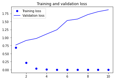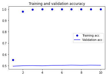 이 모델은 과대적합이 빠르게 시작됩니다. 훈련 샘플 수가 작기 때문에 놀라운 일은 아닙니다. 같은 이유로 검증 정확도와 훈련 정확도 사이에 차이가 큽니다. 검증 정확도는 50% 후반을 달성한 것 같습니다.