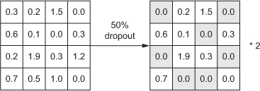 한 층이 정상적으로 훈련하는 동안에는 어떤 입력 샘플에 대해 [0.2, 0.5, 1.3, 0.8, 1.1]벡터를 출력한다고 가정합시다. 드롭아웃을 적용하면 이 벡터의 일부가 무작위로 0으로 바뀝니다. 예를 들어 [0, 0.5, 1.3, 0, .1]이 됩니다. 드롭아웃 비율은 0이 될 특성의 비율입니다.