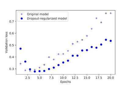 어떤 훈련 네트워크 구조가 주어졌을 때 데이터를 설명할 수 있는 가중치 값의 집합은 여러 개(여러 개의 모델)입니다. 간단한 모델이 복잡한 모델보다 덜 과대적합될 가능성이 높습니다.