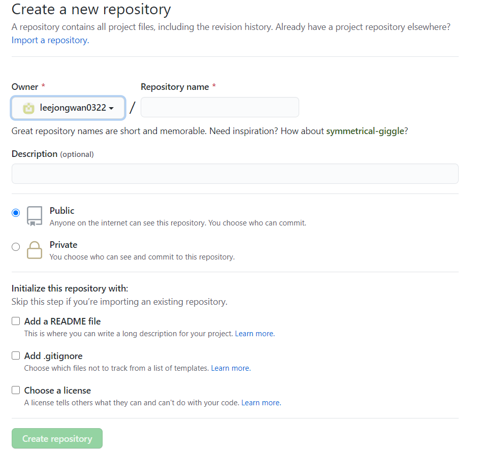Repository name과 Description을 입력후, 누구나 볼 수 있는 public으로 생성할 것인지, 자신과 자신이 설정한 사람만 볼 수 있는 private으로 생성할 것인지 선택합니다. 사냐 프로젝트나 오픈하기 어려운 개인 프로젝트를 하지 않는 한 public로 하는 것을 추천합니다.