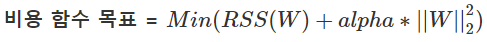 최적 모델을 위한 Cost 함수 목표 = Min(학습데이터 잔차 오류 최소화 + 회귀계수 크기 제어)