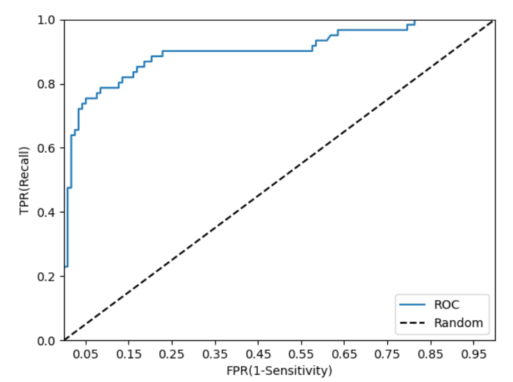 ML측면에서 우수한 분류 모델은 AUC가 1에 근접하고, 클래스를 분류하는 성능이 뛰어남을 의미하며 불량한 분류 모델은 AUC값이 0에 가깝고, 클래스를 분류하는 성능이 떨어짐을 의미합니다. 실제로는 AUC의 최소값은 0.5이므로, 이 경우는 모델의 클래스 분리 능력이 전혀 없음을 뜻합니다.